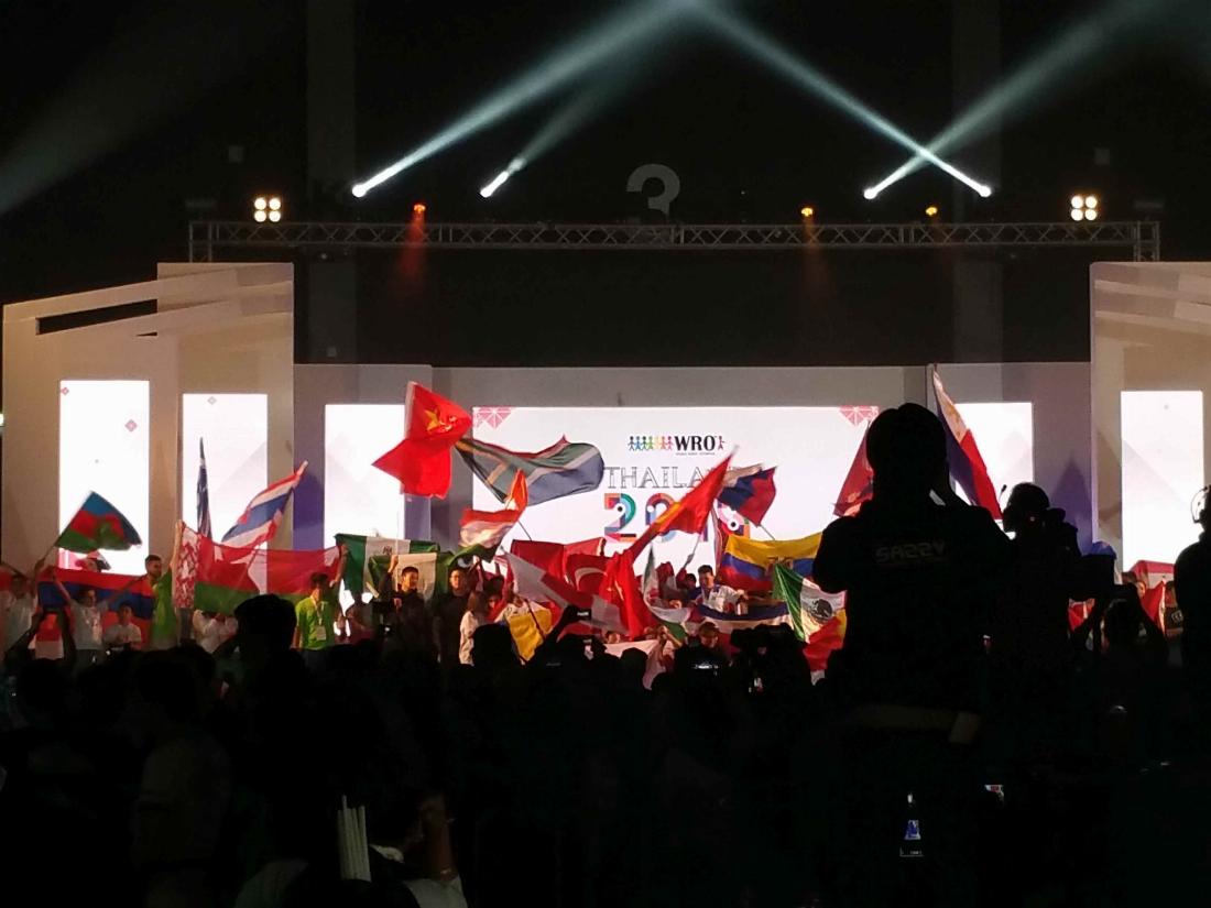 Inoffiziell war bekannt: Wenn das Team zu den oberen 12 gehören soll, wird es noch eine vierte Prüfung durch Juroren geben, auch wenn diese nicht auf dem Plan stand. Zu einigen unserer Nachbarn kamen dementsprechend nochmal ein oder zwei Juroren in den neongelben Westen, zu uns jedoch nicht. Dies war ein wenig ernüchternd, aber nach kurzer Zeit gab es doch noch Grund zur Hoffnung. Eine Jurorin ohne Weste und mit nicht sichtbarem Ausweis besuchte unseren Stand. Vermutlich um zu sehen, wie wir es den „normalen“ Besuchern präsentieren würden. Dann gegen Mittag mussten wir bereits wieder abbauen, alles sollte zur Siegerehrung schon in der Kiste verstaut sein, damit wir den Shuttlebus zum Hotel bekommen. Als wir mit dem Abbau fertig waren, ging es hinüber in die Halle, in der auch die „Friendship-Night“ stattfand. Wieder gab es Tänze und Reden, bevor das für uns Spannendste kam: Die Bekanntgabe der Sieger in den einzelnen Kategorien. Für jede Altersklasse jeder Kategorie wurden jeweils die Plätze acht bis vier genannt. Die Plätze drei bis eins wurden auf die Bühne gebeten und erhielten einen Legopokal sowie eine Auszeichnung. Als dann die Senioren der Open-Category an der Reihe waren, wurde es noch einmal kurz spannend. Wir hatten kaum noch Hoffnung, unter den ersten acht, geschweige denn im ersten Drittel platziert zu sein. Umso größer waren die Überraschung und die Freude, als bekanntgegeben wurde, dass wir den siebten Platz belegen.